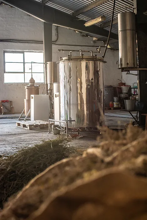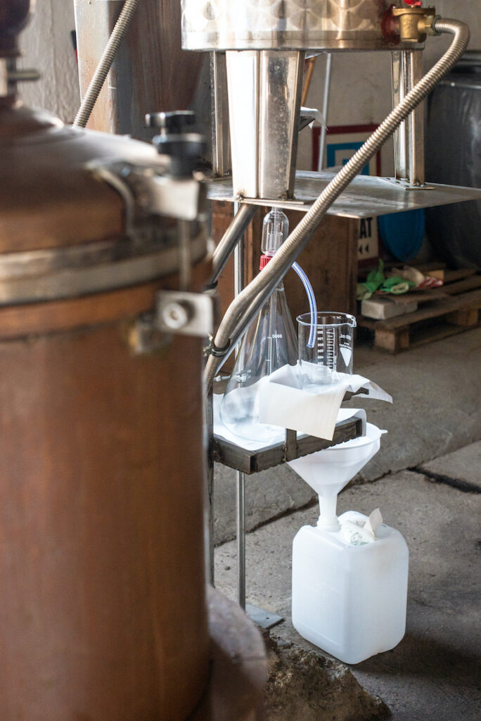 Két üsttel dolgozunk. A 160 literes teljes egészében vörösrézből, a nagyobb 1000 literes, rozsdamentes acélból készült. A megfelelő gőzt egy külön gőzfejlesztő állítja elő. Fontos a tömörítés, hogy az átáramló gőz a lehető legtöbb olajat szabadíthassa ki az illoólajat tároló tokocskákból. Ezért egyszerűen az üstbe mászunk és saját súlyunkat használjuk . Nyár derekán, a legnagyobb melegben – az aratás mellett – ez is embert próbáló feladat.